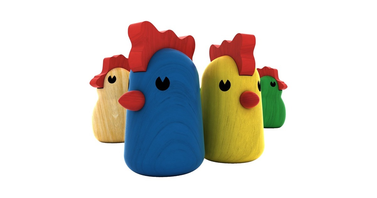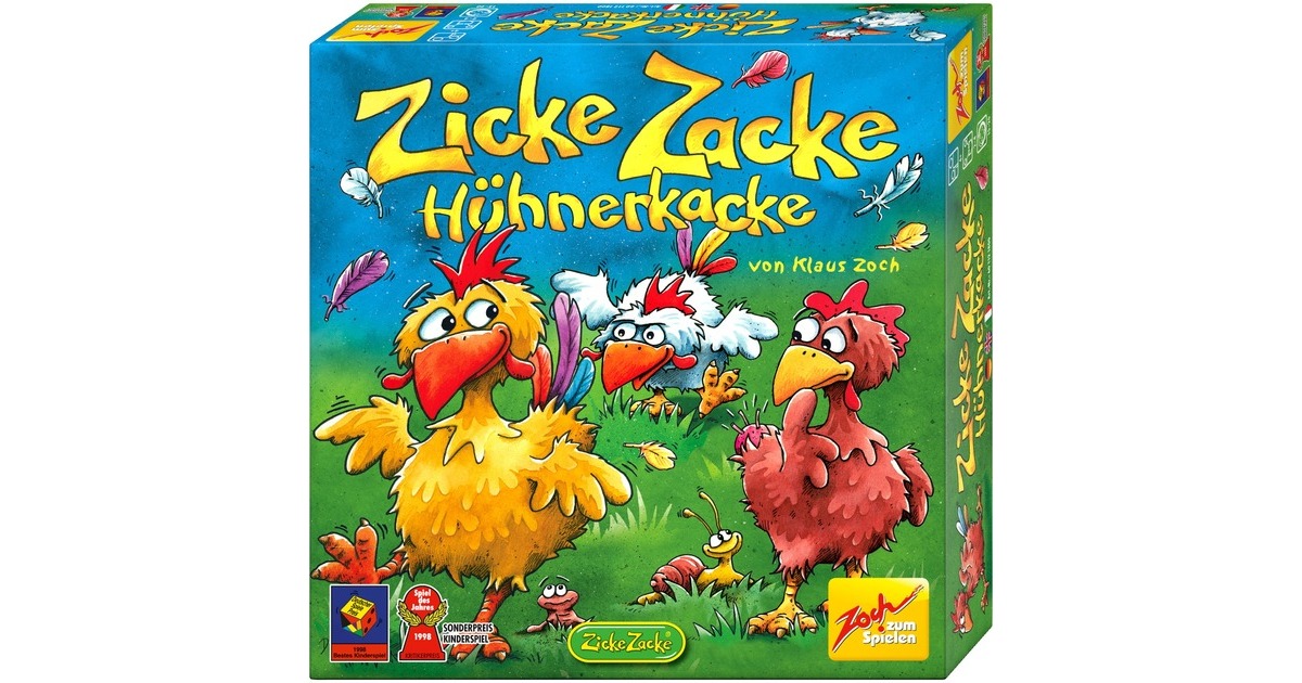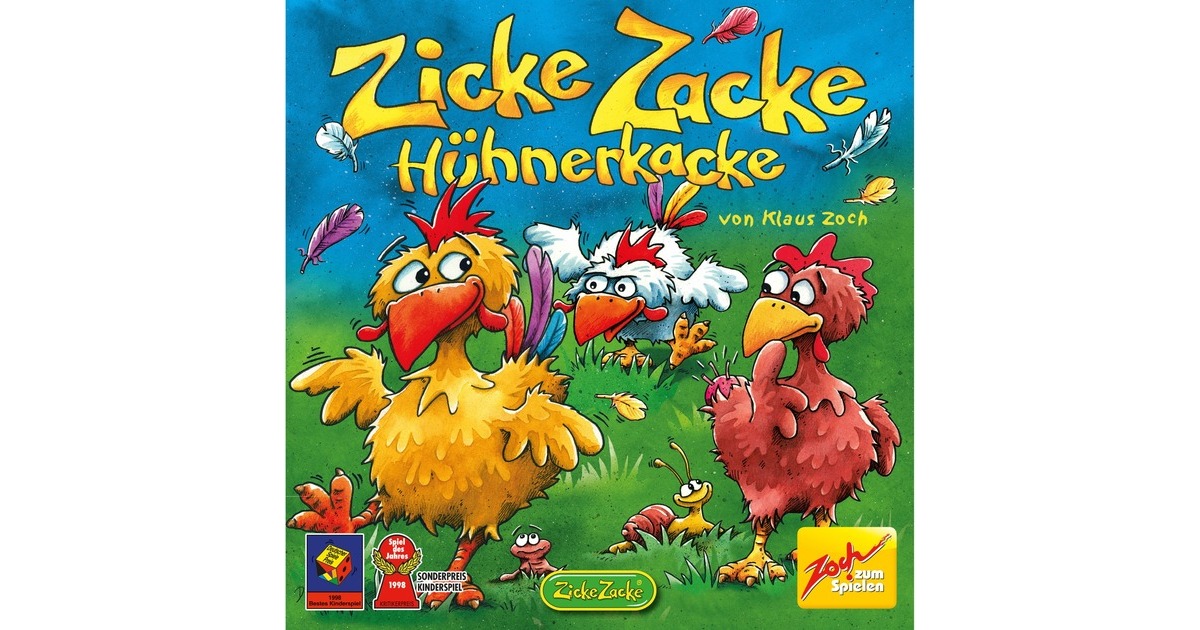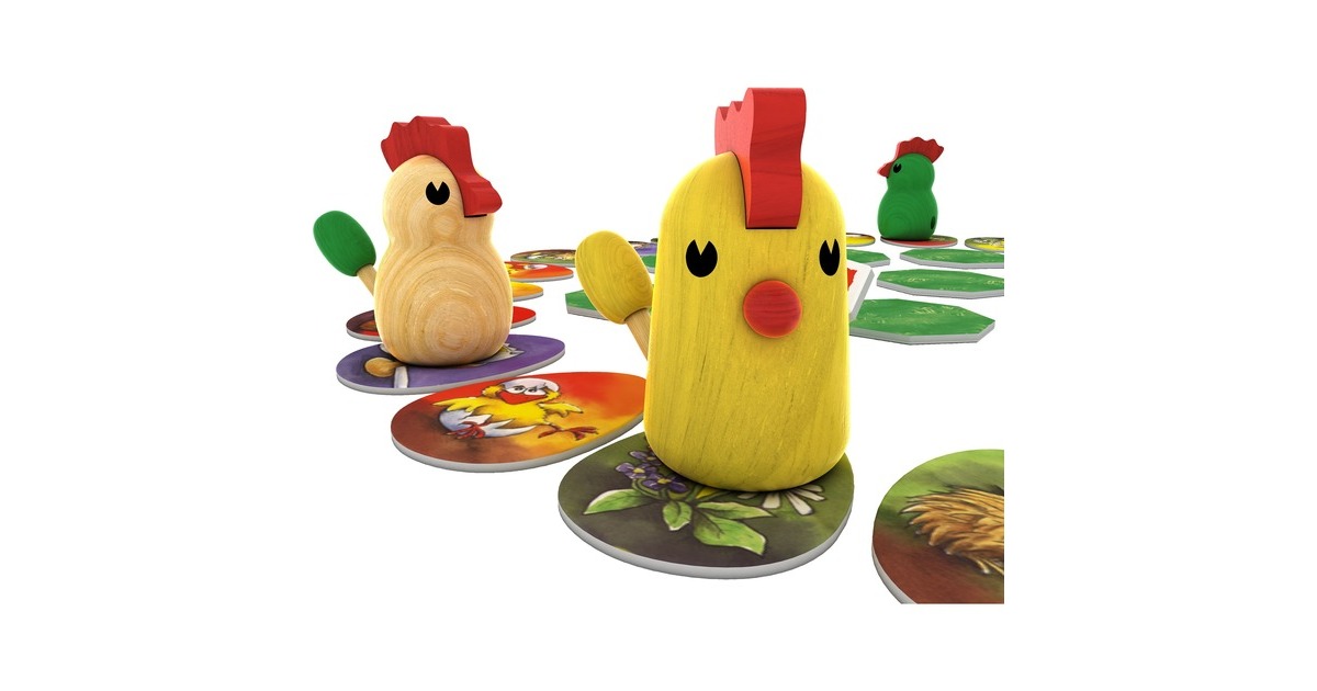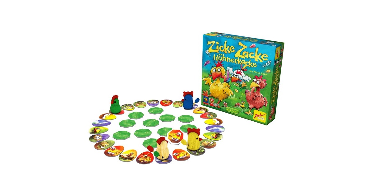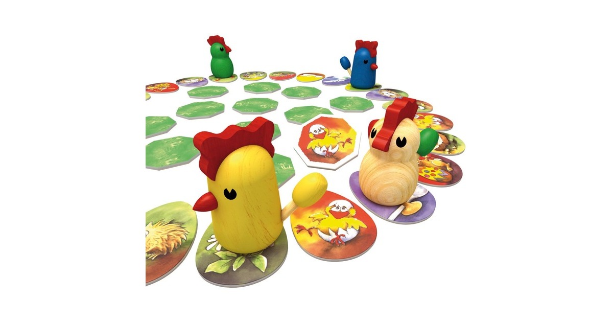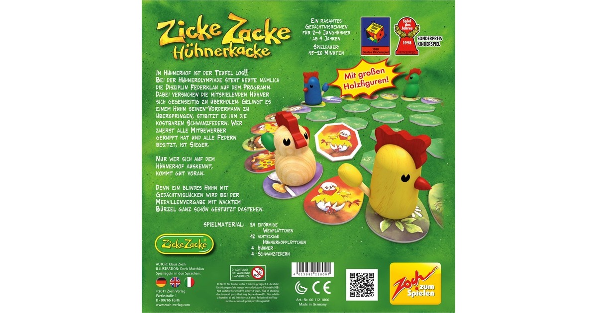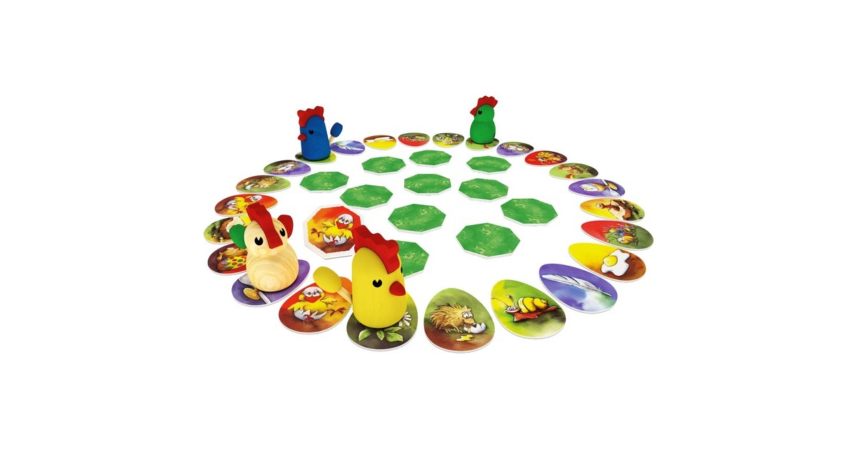 Der Hühnerhof besteht aus 24 eiförmigen Wegplättchen, die kreisförmig um die 12 verdeckten Hühnerhofplättchen gelegt werden. Die dickbauchigen Hühner starten, mit je einer hölzernen Feder ausgestattet, auf unterschiedlichen Wegplättchen. Ziel des Spiels ist es, sich mit den Federn der anderen Hühner zu schmücken. Die rasante Hühnergedächtnisrallye ist ein Klassiker, der nicht nur Kinder hellauf begeistert.Art.-Nr.: 1195365